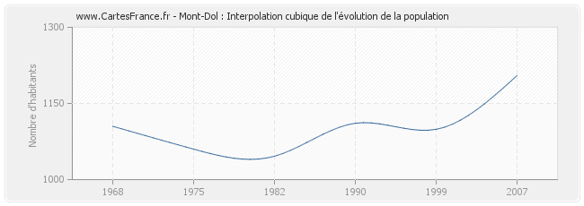 Cette courbe reprend l'historique de la population de Mont-Dol de 1968 à 2007 en interpolation cubique. Ceci permet d'obtenir plus précisément la population de la commune de Mont-Dol les années ou aucun recensement n'a été effectué.