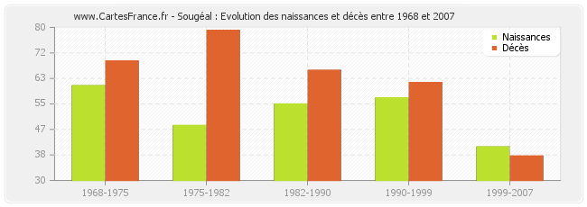 Sougéal : évolution des naissances et décès de 1968 à 2007