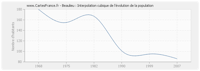 Cette courbe reprend l'historique de la population de Beaulieu de 1968 à 2007 en interpolation cubique. Ceci permet d'obtenir plus précisément la population de la commune de Beaulieu les années ou aucun recensement n'a été effectué.
