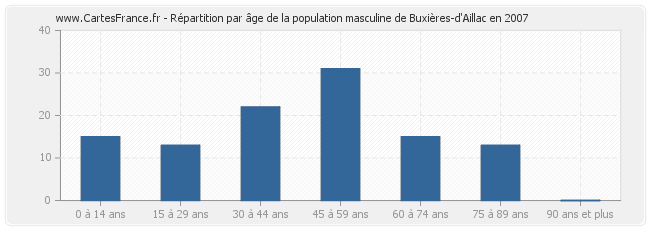 Répartition de la population masculine de Buxières-d'Aillac par âge en 2007 :