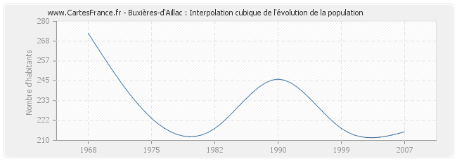Cette courbe reprend l'historique de la population de Buxières-d'Aillac de 1968 à 2007 en interpolation cubique. Ceci permet d'obtenir plus précisément la population de la commune de Buxières-d'Aillac les années ou aucun recensement n'a été effectué.