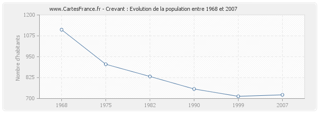 La population de Crevant était de 722 habitants en 2007, 713 habitants en 1999, 757 habitants en 1990, 832 habitants en 1982, 905 habitants en 1975 et 1 112 habitants en 1968.