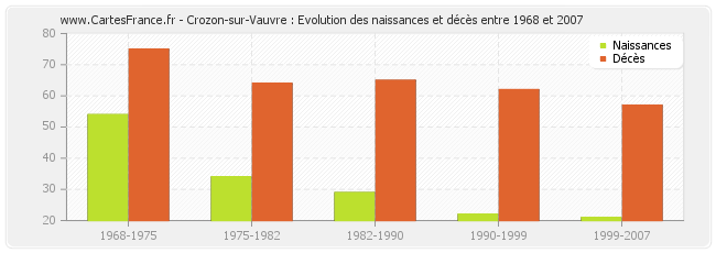Crozon-sur-Vauvre : évolution des naissances et décès de 1968 à 2007