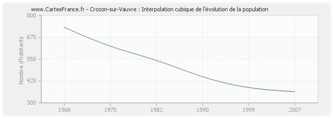Cette courbe reprend l'historique de la population de Crozon-sur-Vauvre de 1968 à 2007 en interpolation cubique. Ceci permet d'obtenir plus précisément la population de la commune de Crozon-sur-Vauvre les années ou aucun recensement n'a été effectué.