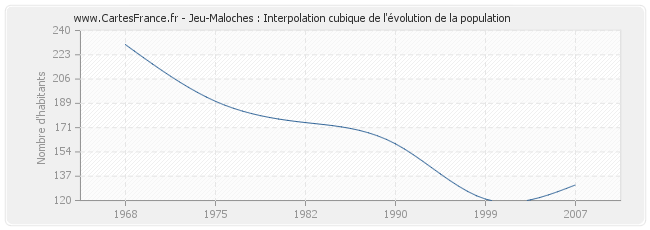 Cette courbe reprend l'historique de la population de Jeu-Maloches de 1968 à 2007 en interpolation cubique. Ceci permet d'obtenir plus précisément la population de la commune de Jeu-Maloches les années ou aucun recensement n'a été effectué.