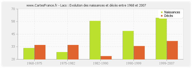 Lacs : évolution des naissances et décès de 1968 à 2007