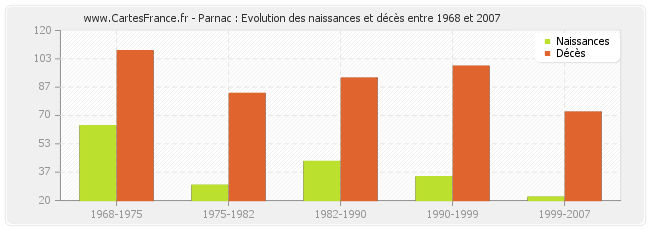 Parnac : évolution des naissances et décès de 1968 à 2007