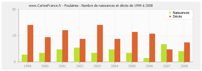 - Poulaines en 2008 : 6 naissances et 11 décès