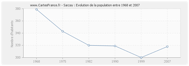 Cette courbe reprend l'historique de la population de Sarzay de 1968 à 2007 en interpolation cubique. Ceci permet d'obtenir plus précisément la population de la commune de Sarzay les années ou aucun recensement n'a été effectué.