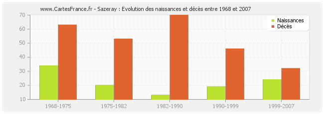 Sazeray : évolution des naissances et décès de 1968 à 2007