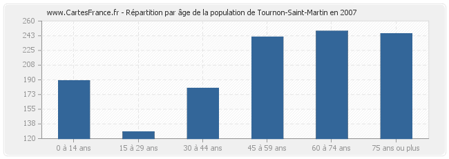 - Population de Tournon-Saint-Martin de 75 ans ou plus : 245 habitants