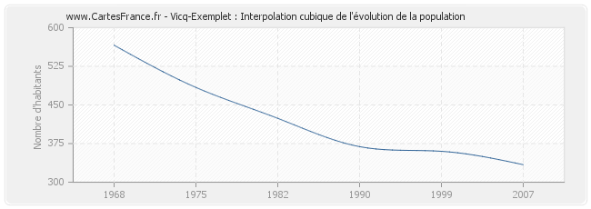 Cette courbe reprend l'historique de la population de Vicq-Exemplet de 1968 à 2007 en interpolation cubique. Ceci permet d'obtenir plus précisément la population de la commune de Vicq-Exemplet les années ou aucun recensement n'a été effectué.
