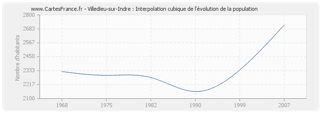 Cette courbe reprend l'historique de la population de Villedieu-sur-Indre de 1968 à 2007 en interpolation cubique. Ceci permet d'obtenir plus précisément la population de la commune de Villedieu-sur-Indre les années ou aucun recensement n'a été effectué.