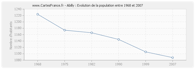 La population d'Abilly était de 1 088 habitants en 2007, 1 106 habitants en 1999, 1 145 habitants en 1990, 1 166 habitants en 1982, 1 174 habitants en 1975 et 1 224 habitants en 1968.