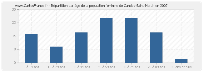 Répartition de la population féminine de Candes-Saint-Martin par âge en 2007 :