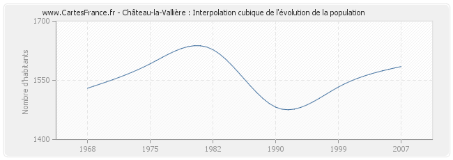 Cette courbe reprend l'historique de la population de Château-la-Vallière de 1968 à 2007 en interpolation cubique. Ceci permet d'obtenir plus précisément la population de la commune de Château-la-Vallière les années ou aucun recensement n'a été effectué.