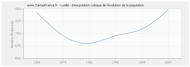 Cette courbe reprend l'historique de la population de Luzillé de 1968 à 2007 en interpolation cubique. Ceci permet d'obtenir plus précisément la population de la commune de Luzillé les années ou aucun recensement n'a été effectué.