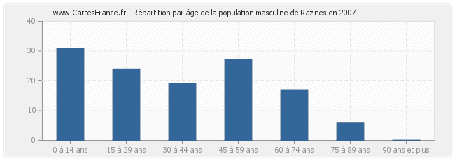 - Hommes de 0 à 14 ans habitant Razines : 31