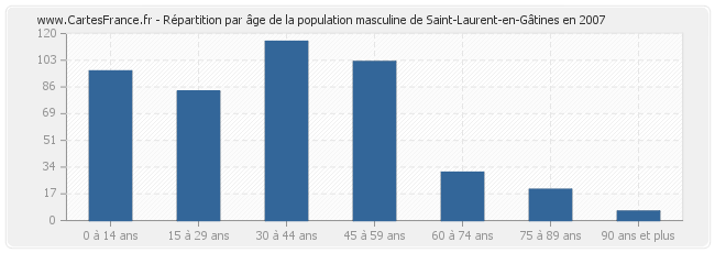 Répartition de la population masculine de Saint-Laurent-en-Gâtines par âge en 2007 :