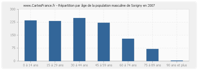 Répartition de la population masculine de Sorigny par âge en 2007 :
