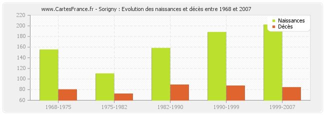 Sorigny : évolution des naissances et décès de 1968 à 2007