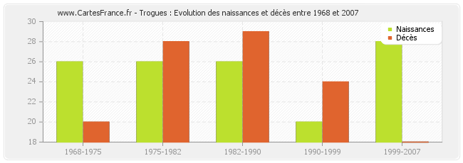 Trogues : évolution des naissances et décès de 1968 à 2007