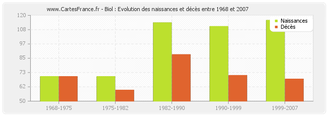 Cette courbe reprend l'historique de la population de Biol de 1968 à 2007 en interpolation cubique. Ceci permet d'obtenir plus précisément la population de la commune de Biol les années ou aucun recensement n'a été effectué.