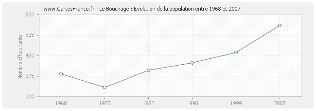 La population de Le Bouchage était de 561 habitants en 2007, 462 habitants en 1999, 424 habitants en 1990, 397 habitants en 1982, 334 habitants en 1975 et 384 habitants en 1968.