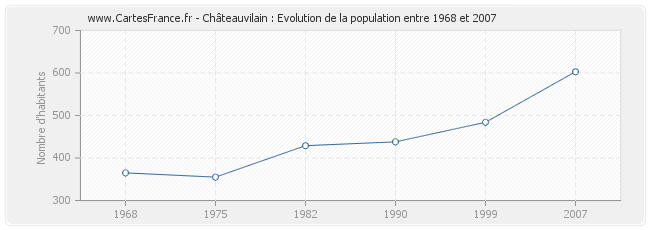 La population de Châteauvilain était de 603 habitants en 2007, 484 habitants en 1999, 438 habitants en 1990, 429 habitants en 1982, 355 habitants en 1975 et 365 habitants en 1968.