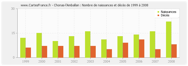 - Chonas-l'Amballan en 2008 : 22 naissances et 8 décès