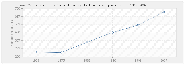 La population de La Combe-de-Lancey était de 665 habitants en 2007, 529 habitants en 1999, 452 habitants en 1990, 350 habitants en 1982, 243 habitants en 1975 et 249 habitants en 1968.