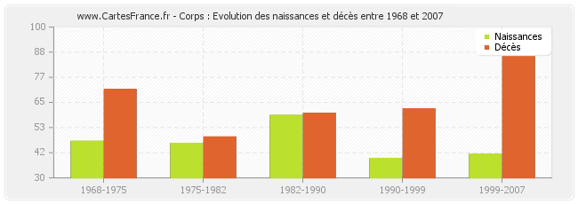 La population de Corps était de 456 habitants en 2007, 453 habitants en 1999, 512 habitants en 1990, 505 habitants en 1982, 465 habitants en 1975 et 556 habitants en 1968.