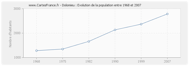 La population de Dolomieu était de 2 787 habitants en 2007, 2 369 habitants en 1999, 2 135 habitants en 1990, 1 662 habitants en 1982, 1 348 habitants en 1975 et 1 283 habitants en 1968.