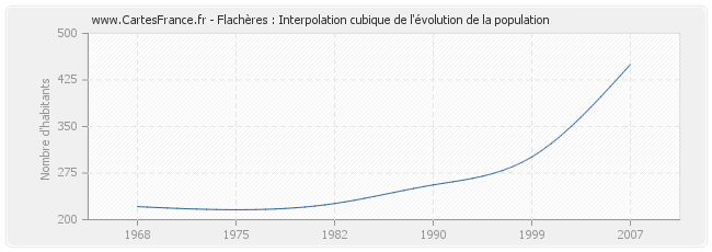 Cette courbe reprend l'historique de la population de Flachères de 1968 à 2007 en interpolation cubique. Ceci permet d'obtenir plus précisément la population de la commune de Flachères les années ou aucun recensement n'a été effectué.
