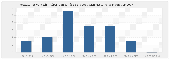 Répartition de la population masculine de Marcieu par âge en 2007 :