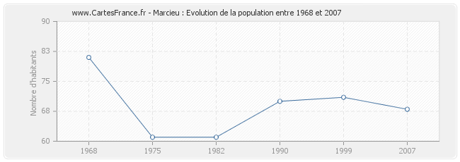 La population de Marcieu était de 68 habitants en 2007, 71 habitants en 1999, 70 habitants en 1990, 61 habitants en 1982, 61 habitants en 1975 et 81 habitants en 1968.