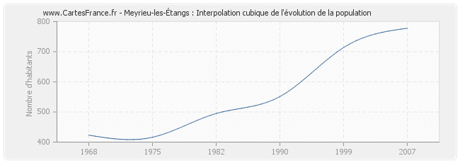 Cette courbe reprend l'historique de la population de Meyrieu-les-Étangs de 1968 à 2007 en interpolation cubique. Ceci permet d'obtenir plus précisément la population de la commune de Meyrieu-les-Étangs les années ou aucun recensement n'a été effectué.