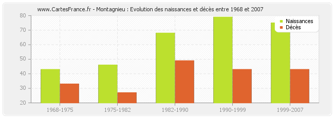 Montagnieu : évolution des naissances et décès de 1968 à 2007