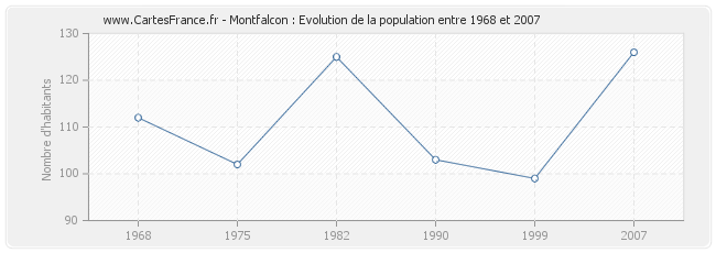 La population de Montfalcon était de 126 habitants en 2007, 99 habitants en 1999, 103 habitants en 1990, 125 habitants en 1982, 102 habitants en 1975 et 112 habitants en 1968.