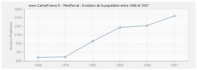 La population de Montferrat était de 1 472 habitants en 2007, 1 286 habitants en 1999, 1 249 habitants en 1990, 981 habitants en 1982, 680 habitants en 1975 et 669 habitants en 1968.