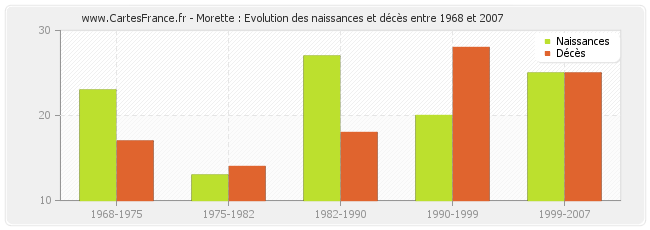 Morette : évolution des naissances et décès de 1968 à 2007