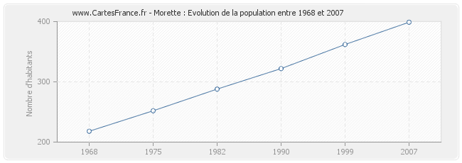 La population de Morette était de 399 habitants en 2007, 362 habitants en 1999, 322 habitants en 1990, 288 habitants en 1982, 252 habitants en 1975 et 218 habitants en 1968.