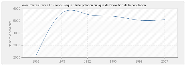 Cette courbe reprend l'historique de la population de Pont-Évêque de 1968 à 2007 en interpolation cubique. Ceci permet d'obtenir plus précisément la population de la commune de Pont-Évêque les années ou aucun recensement n'a été effectué.