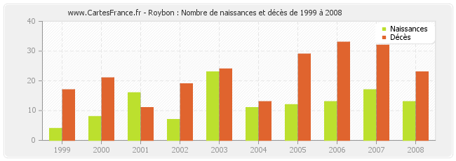 Roybon : évolution des naissances et décès de 1968 à 2007