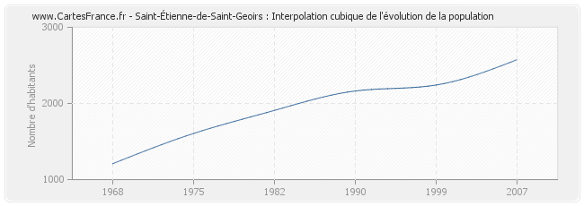Cette courbe reprend l'historique de la population de Saint-Étienne-de-Saint-Geoirs de 1968 à 2007 en interpolation cubique. Ceci permet d'obtenir plus précisément la population de la commune de Saint-Étienne-de-Saint-Geoirs les années ou aucun recensement n'a été effectué.