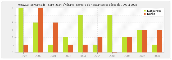 - Saint-Jean-d'Hérans en 2000 : 4 naissances et 6 décès