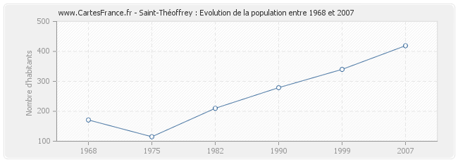 La population de Saint-Théoffrey était de 419 habitants en 2007, 340 habitants en 1999, 279 habitants en 1990, 210 habitants en 1982, 115 habitants en 1975 et 171 habitants en 1968.
