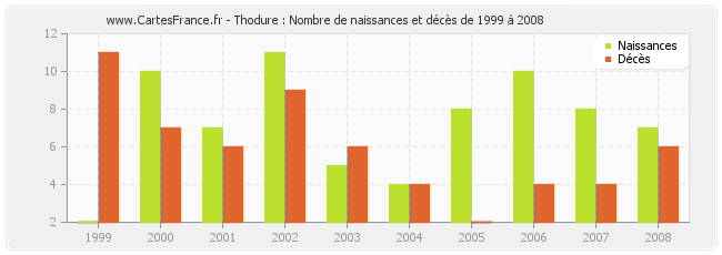 Thodure : évolution des naissances et décès de 1968 à 2007