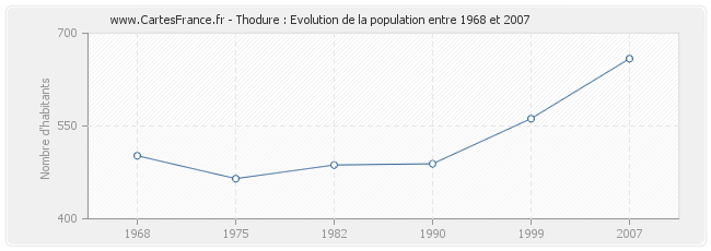 La population de Thodure était de 659 habitants en 2007, 562 habitants en 1999, 489 habitants en 1990, 487 habitants en 1982, 465 habitants en 1975 et 502 habitants en 1968.