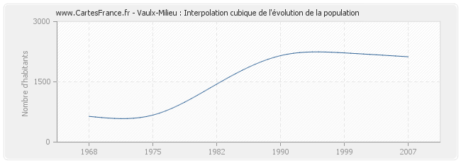 Cette courbe reprend l'historique de la population de Vaulx-Milieu de 1968 à 2007 en interpolation cubique. Ceci permet d'obtenir plus précisément la population de la commune de Vaulx-Milieu les années ou aucun recensement n'a été effectué.